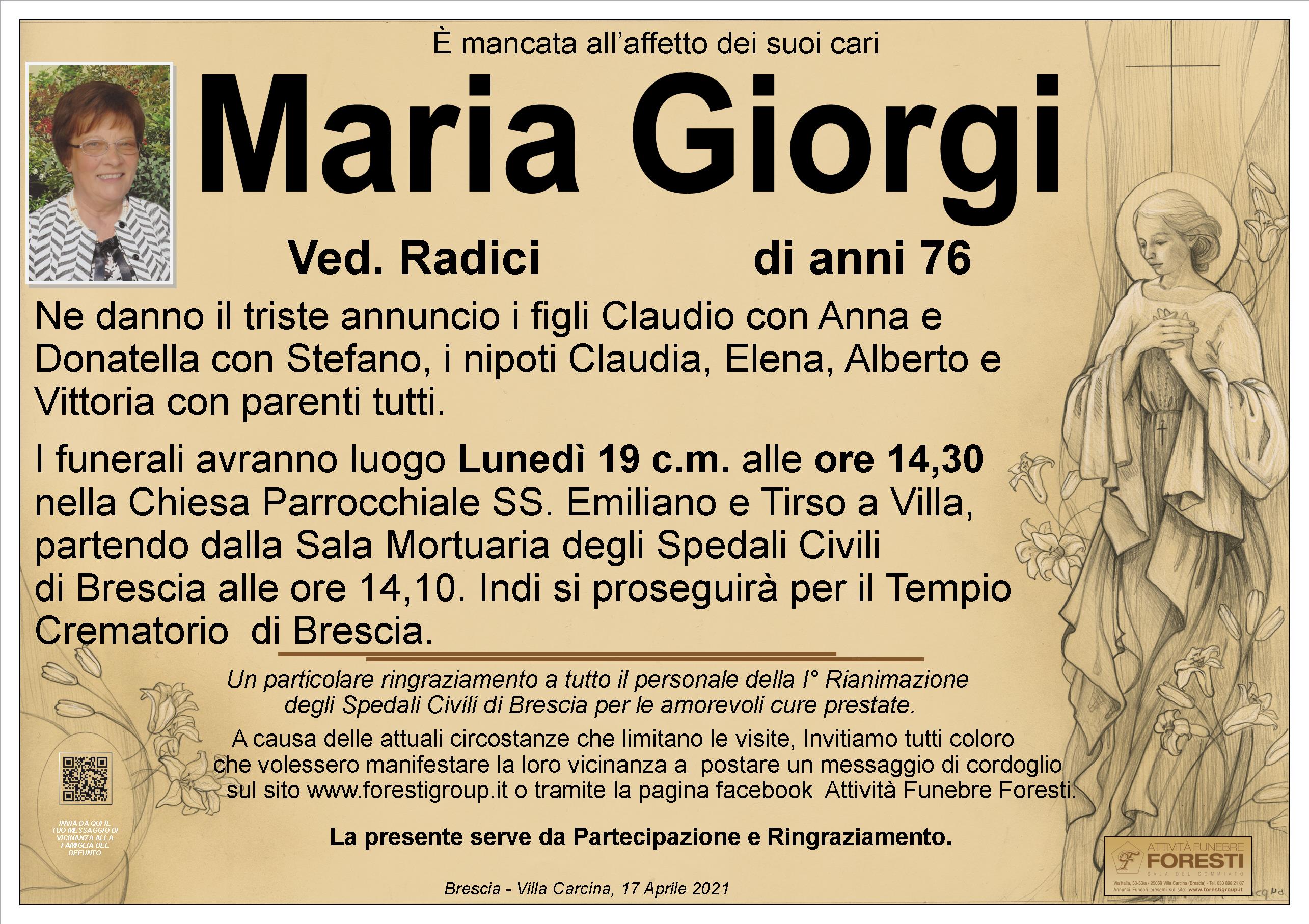 I funerali avranno luogo Lunedì 19 c.m. alle ore 14,30 nella Chiesa Parrocchiale SS. Emiliano e Tirso a Villa, partendo dalla Sala Mortuaria degli Spedali Civili di Brescia alle ore 14,10. Indi si proseguirà per il Tempio Crematorio di Brescia.