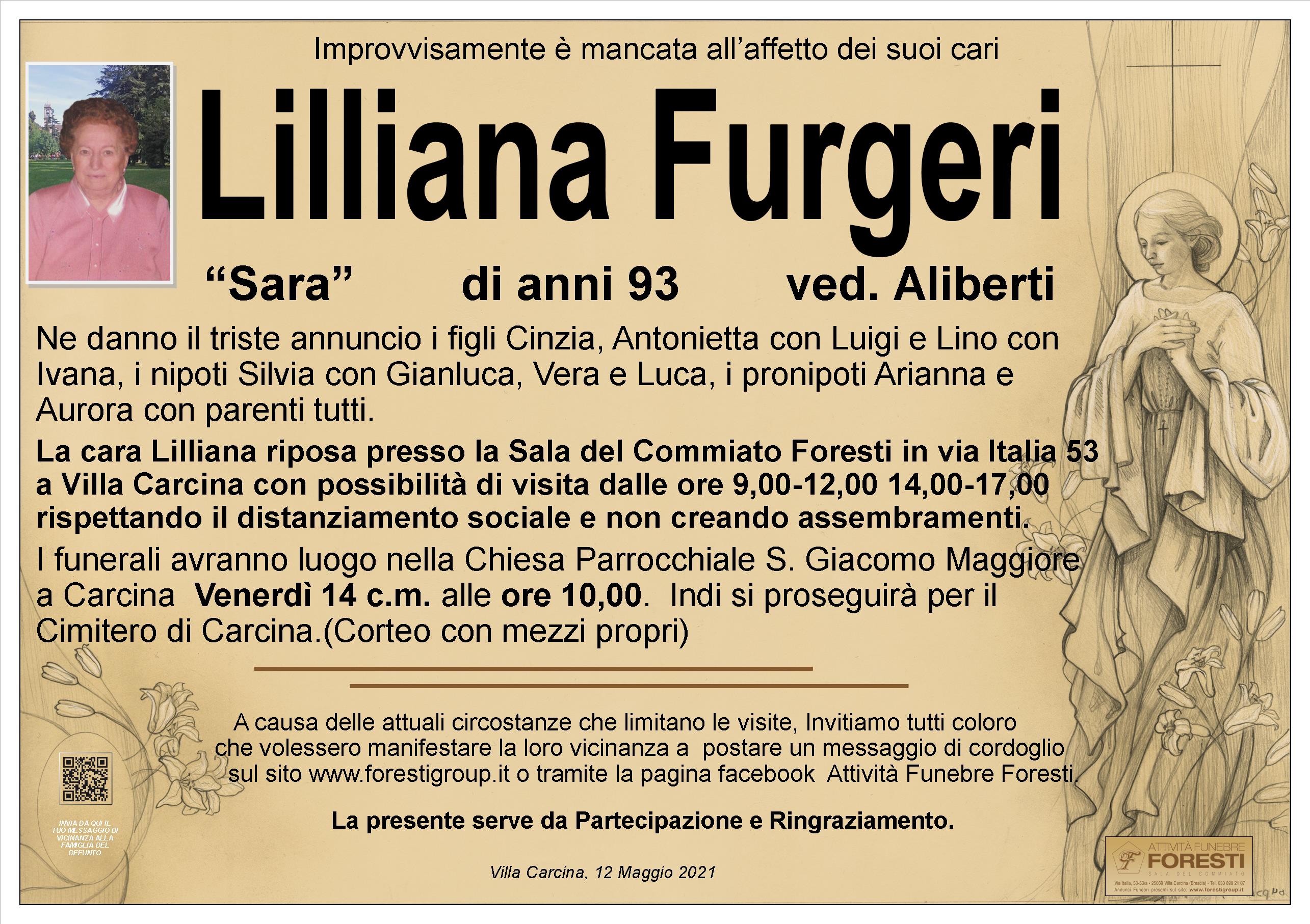La cara Lilliana riposa presso la Sala del Commiato Foresti in via Italia 53 a Villa Carcina con possibilità di visita dalle ore 9,00-12,00 14,00-17,00 rispettando il distanziamento sociale e non creando assembramenti.