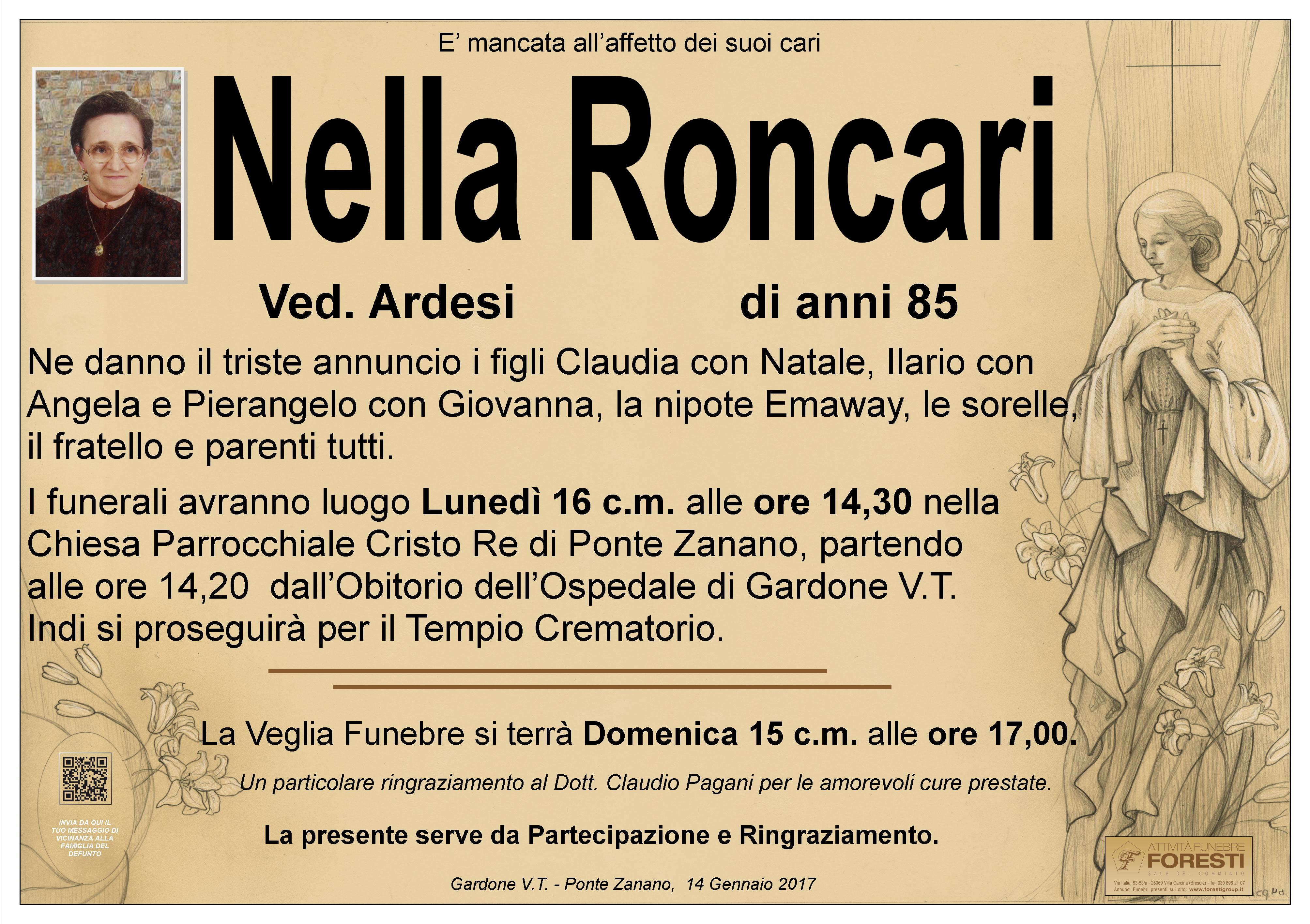 SUCCESSIVAMENTE LE CENERI DELLA CARA NELLA VERRANNO TUMULATE NEL CIMITERO DI PONTE ZANANO.