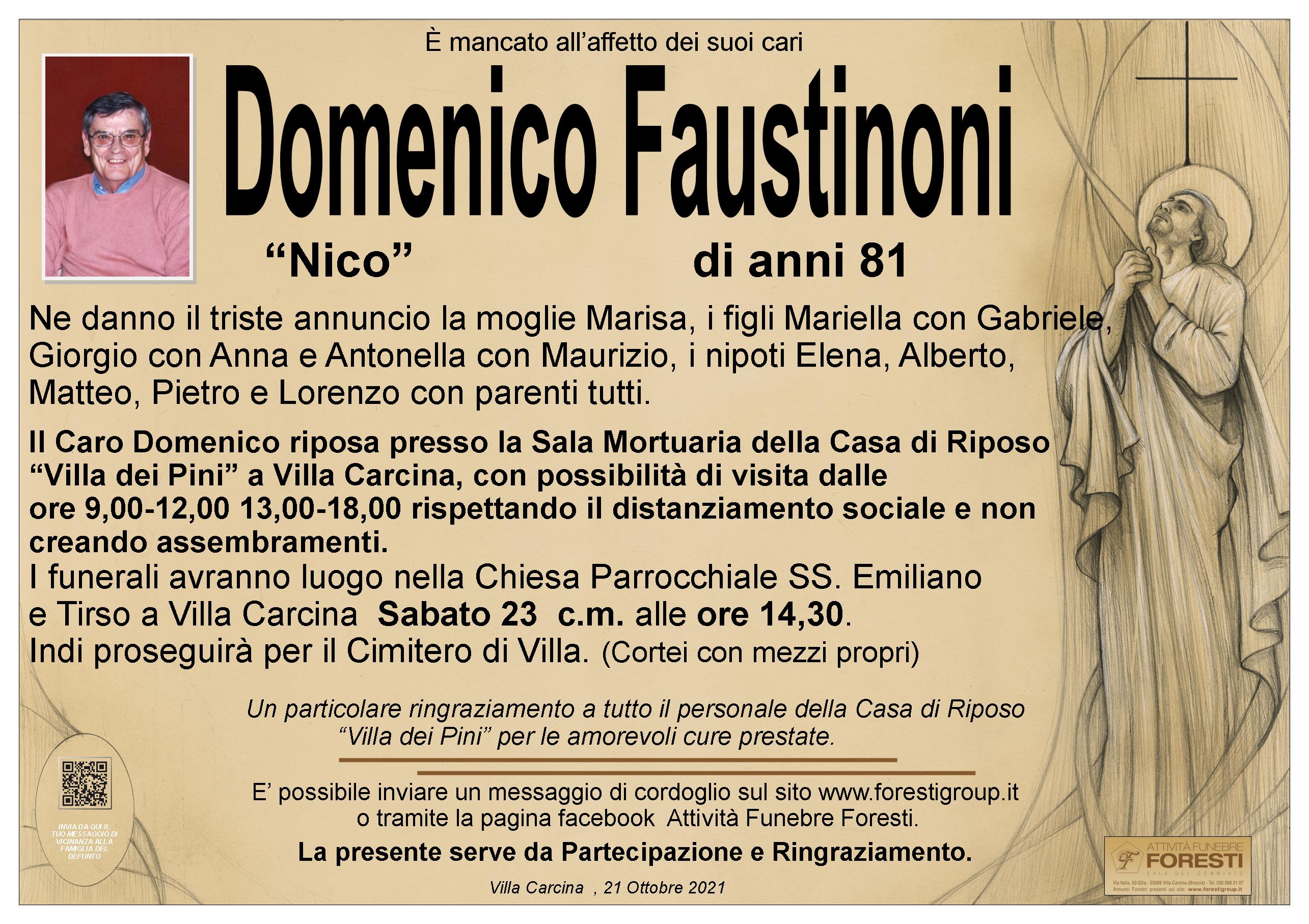 Carissimi ho appreso con tristezza della morte del caro Domenico sono dispiaciuto di non Poter partecipare alle esequie ma purtroppo ho un impegno qui a Gardone Riv. Dove sostituisco il parroco.Vi ricordo nella S.Messa che celebro per Domenico e rinnovo le più sentite condoglianze anche a nome di mio papà Orfeo. Don Oliviero Faustinoni.