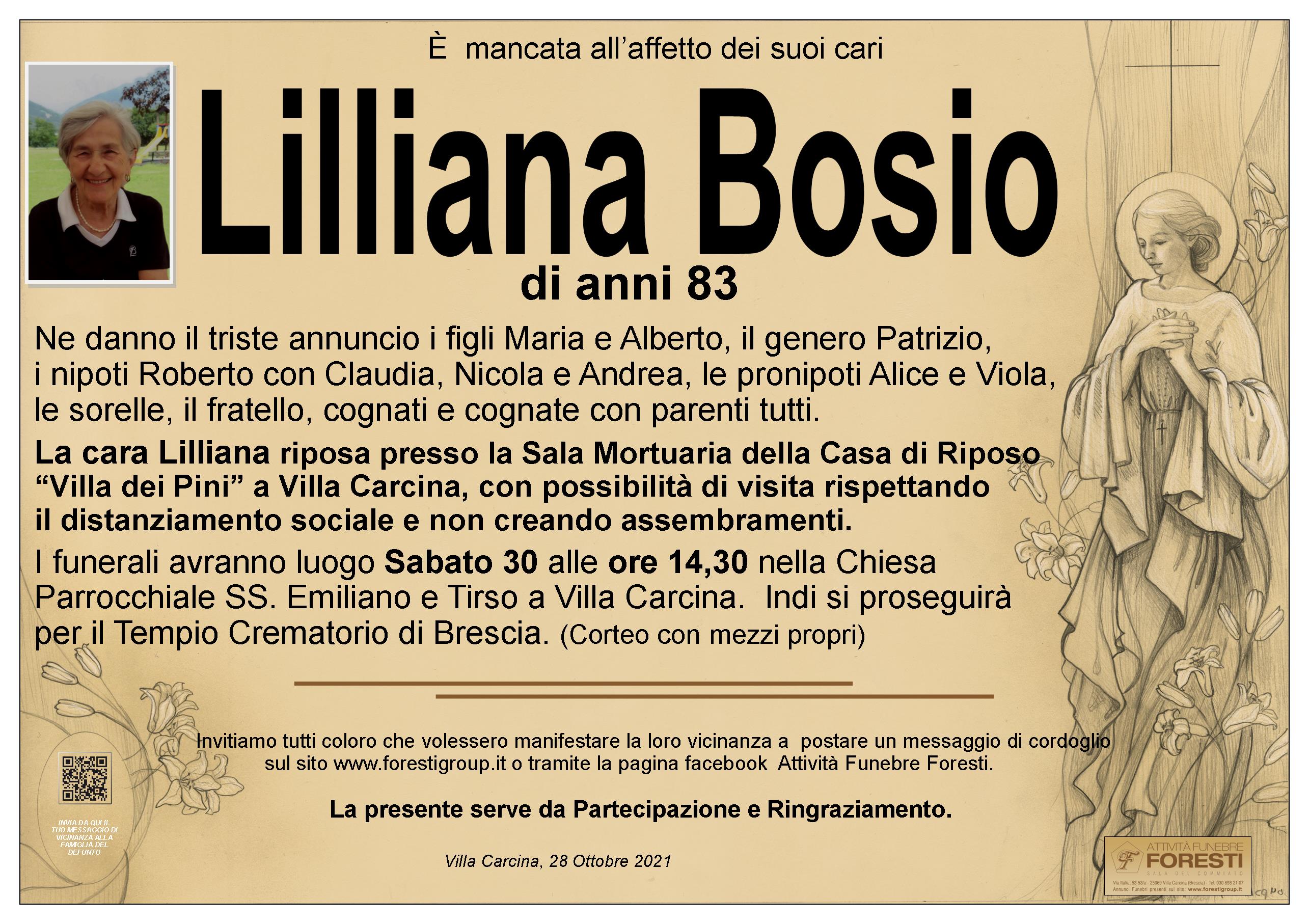 La cara Lilliana riposa presso la Sala Mortuaria della Casa di Riposo “Villa dei Pini” a Villa Carcina, con possibilità di visita rispettando il distanziamento sociale e non creando assembramenti.