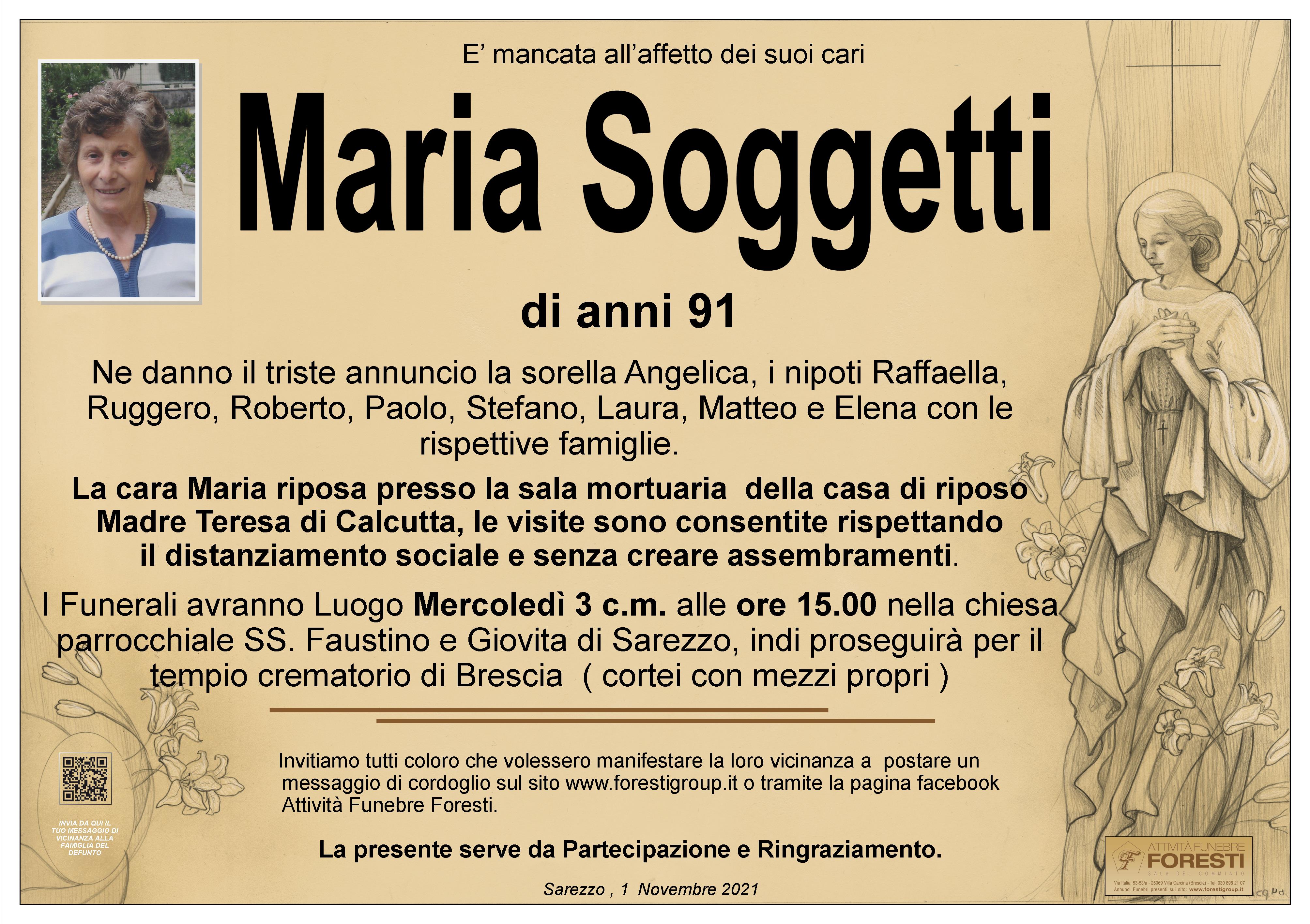 Dorina Astori e figli con famiglie sono vicini ad Angelica e a tutta la famiglia Soggetti per la morte della cara Maria. Condividono il dolore del distacco nella preghiera e nel ricordo di tanti bei momenti passati insieme. Con affetto ed amicizia, un abbraccio a tutti