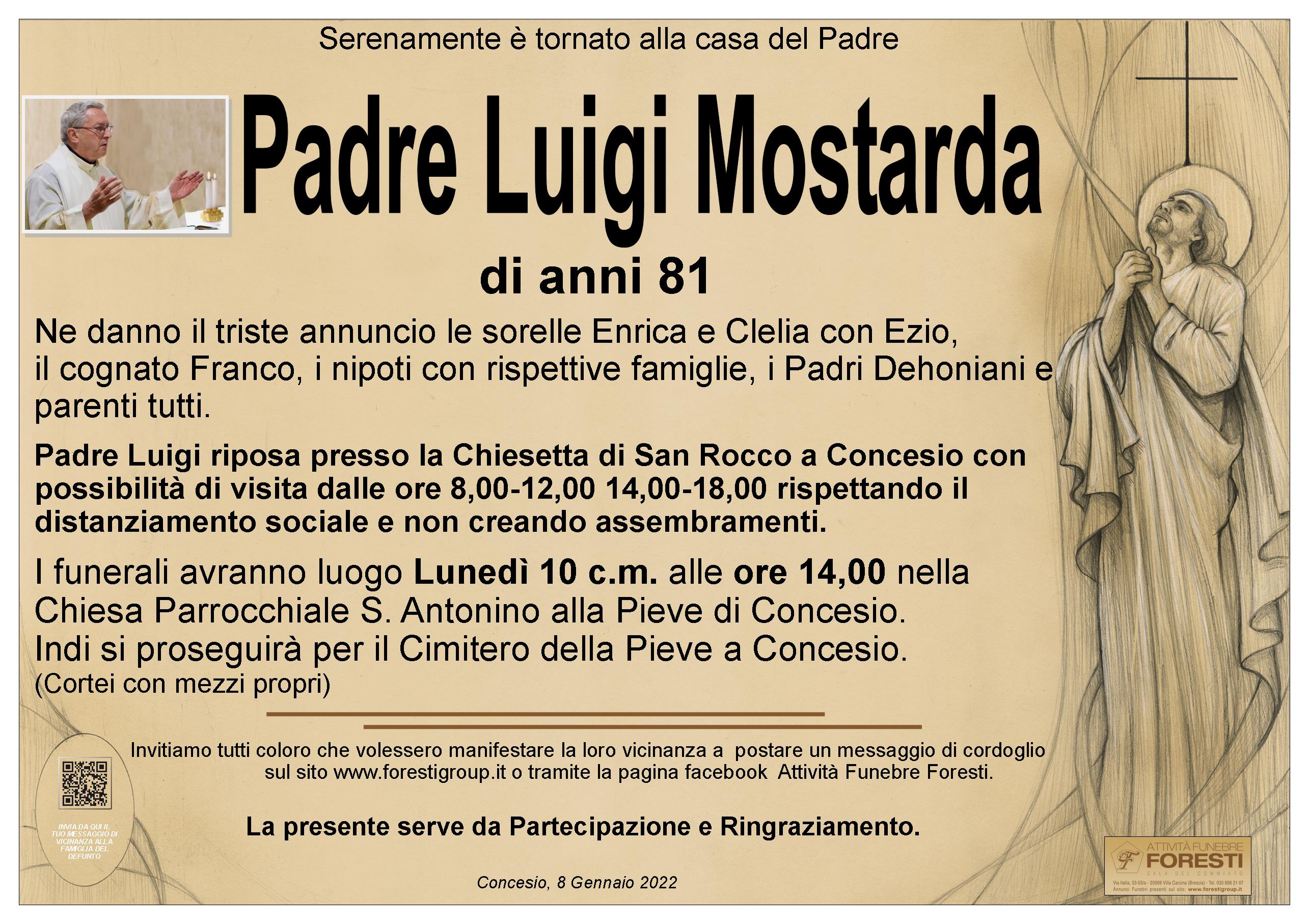 Caro Padre Luigi Mostarda con molto dispiacere ho saputo della tua assenza che sei venuto a mancare ieri notte. Mi ricordo quando eri nella parrocchia di Cristo Re a Milano a fare il parroco eri molto aperto con i parrocchiani i bambini ma sopratutto mi ricordo quando siamo andati a Fatima con i miei genitori e proprio nella chiesa dov'era la Suor Lucia avevo fatto la chierichetto con Elisa Gallini che ricordi indelebili. Ora che sei lassù guidaci e vegliaci. Mi ricordo di averti telefonato il 22 ottobre perché volevo venire a trovarti con Monica e Renata ma purtroppo non ci siamo più sentiti. Vegliaci da lassù Famiglia Sambin
