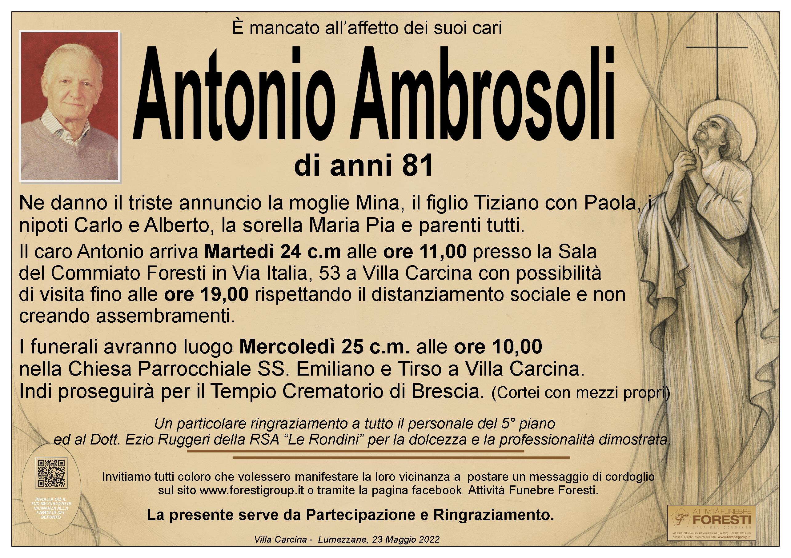 I funerali avranno luogo Mercoledì 25 c.m. alle ore 10,00 nella Chiesa Parrocchiale SS. Emiliano e Tirso a Villa Carcina. Indi proseguirà per il Tempio Crematorio di Brescia. (Cortei con mezzi propri)