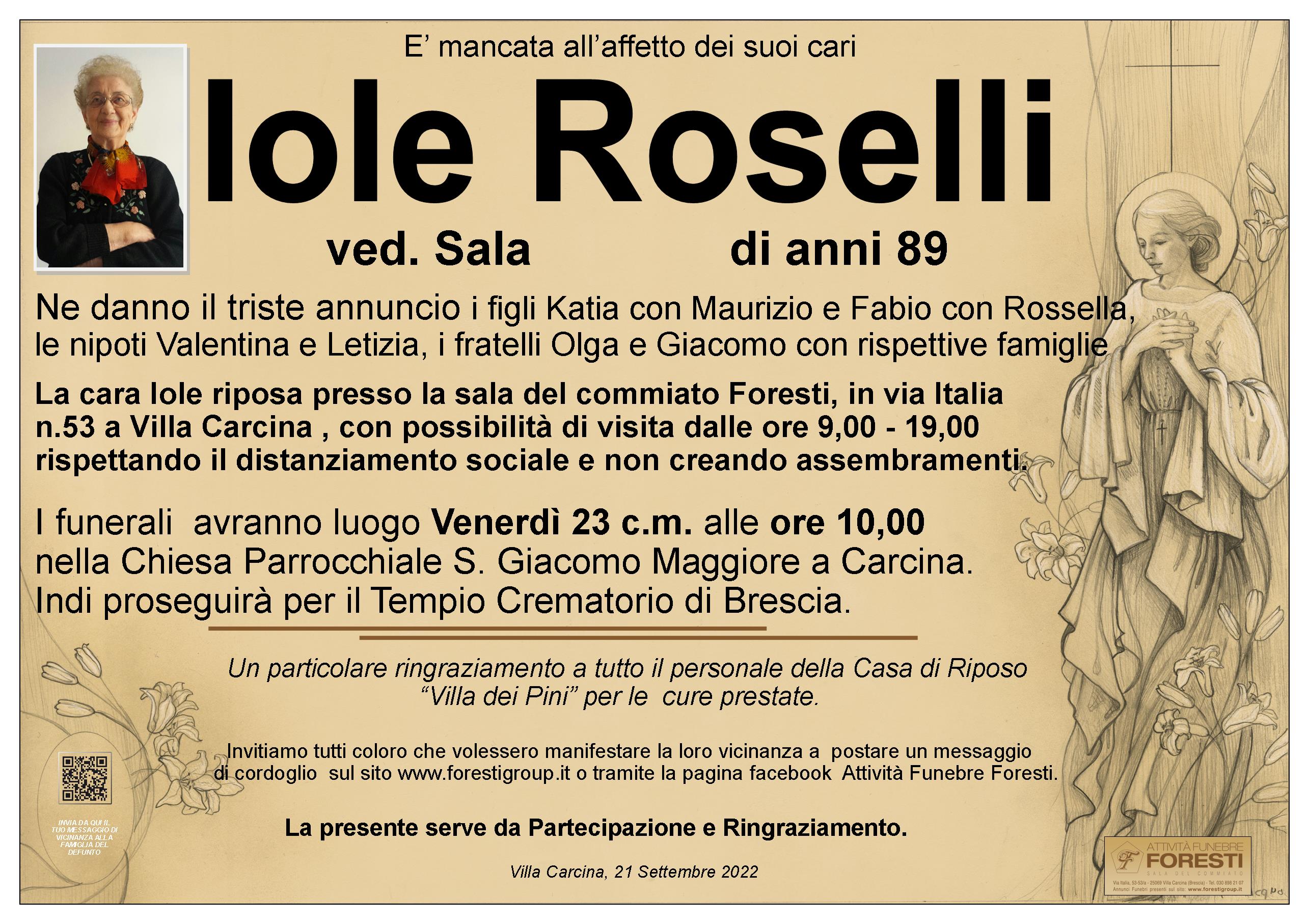 La cara Iole riposa presso la sala del commiato Foresti, in via Italia n.53 a Villa Carcina , con possibilità di visita dalle ore 9,00 - 19,00 rispettando il distanziamento sociale e non creando assembramenti.