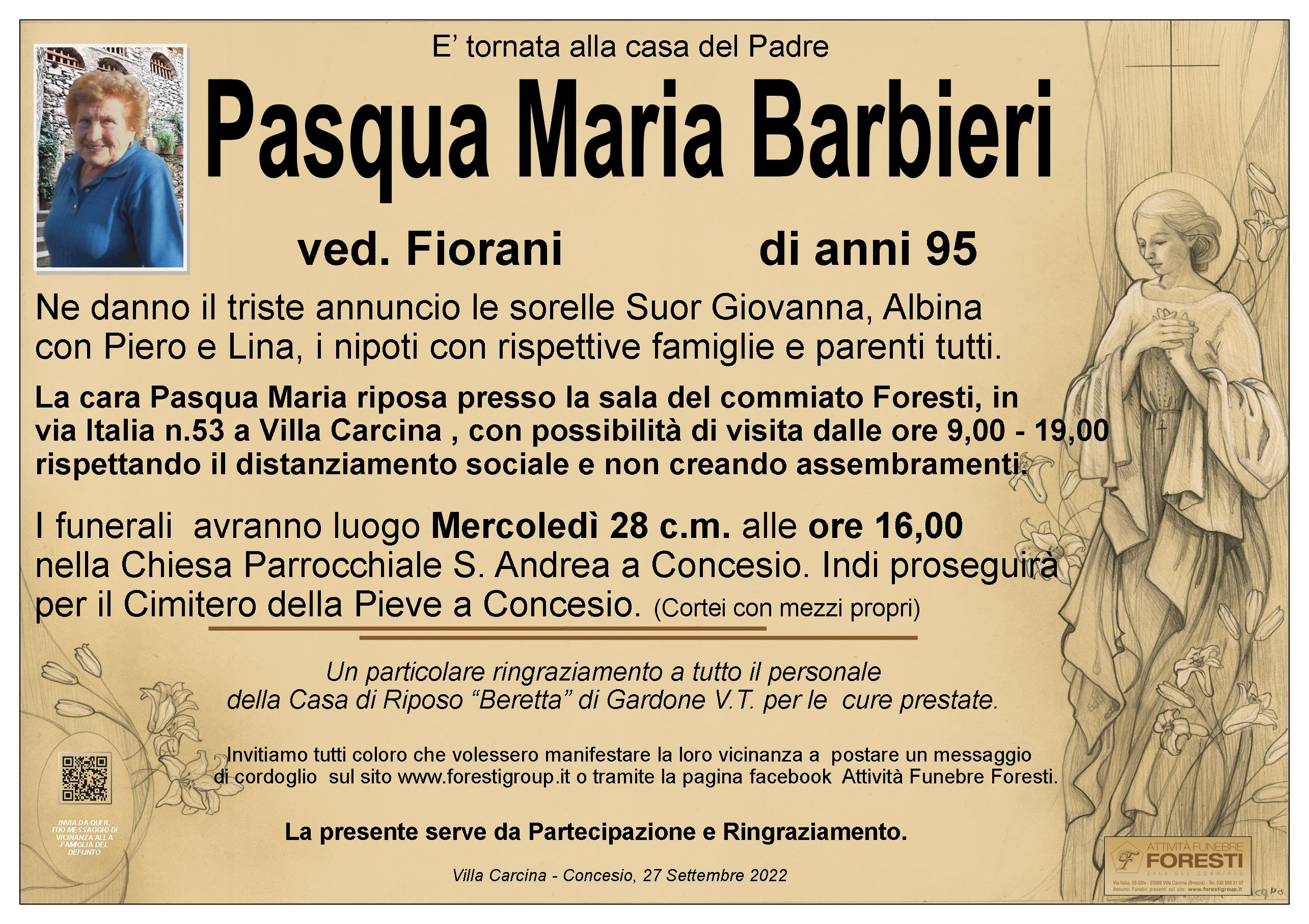 La cara Pasqua Maria riposa presso la sala del commiato Foresti, in via Italia n.53 a Villa Carcina , con possibilità di visita dalle ore 9,00 - 19,00 rispettando il distanziamento sociale e non creando assembramenti.