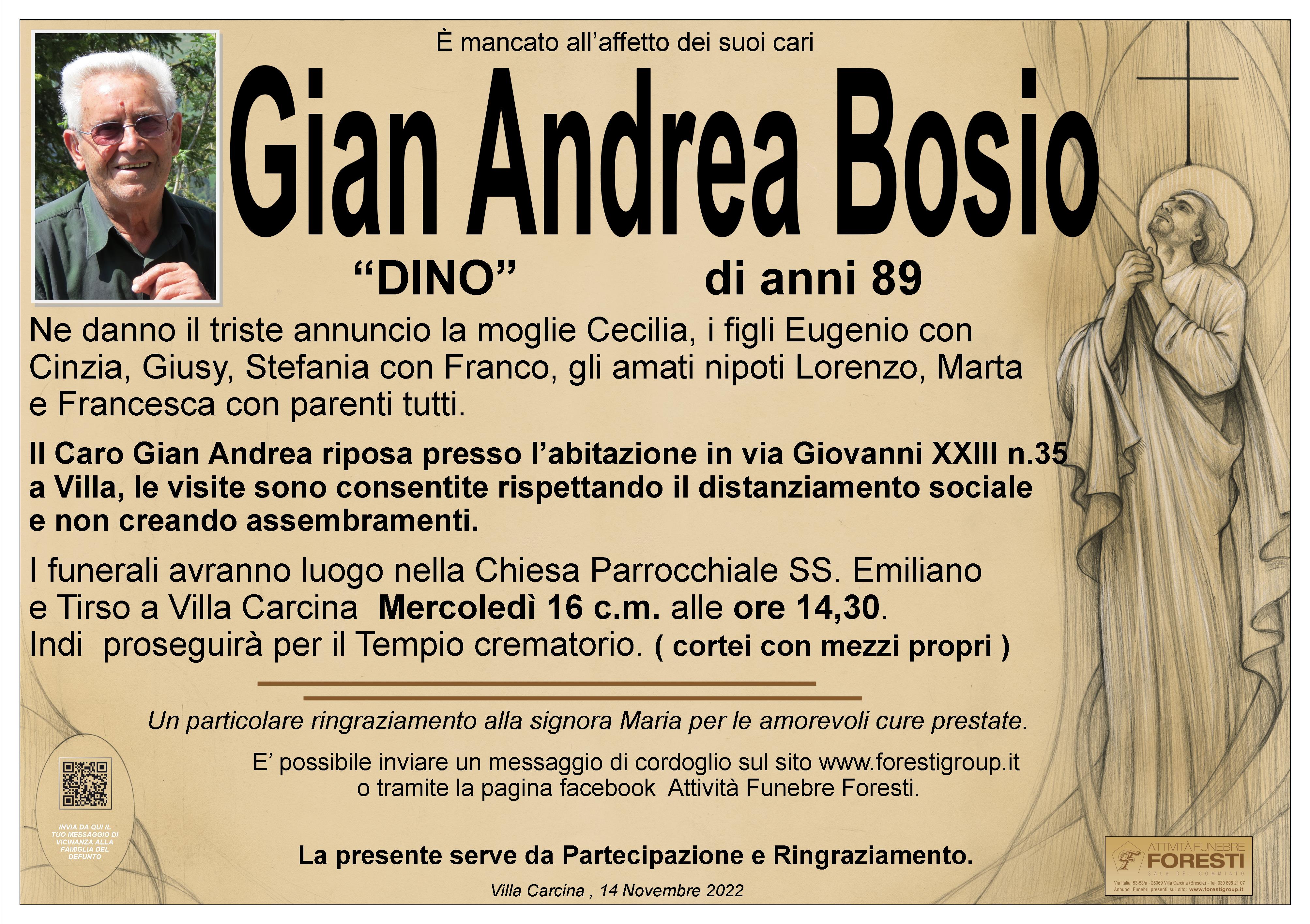 IL Presidente provinciale Lucio Pedroni dell' A.N.P.I. Brescia, Il Comitato e tutte le Sezioni della Provincia, sono vicini, in questo triste momento, alla moglie Cecilia, ai figli e a tutti i famigliari, per la perdita del loro caro Gian Andrea Bosio Presidente, per lunghi anni della sezione A.N.P.I. di Villa Carcina. Un grazie per la sua militanza e per l'opera di diffusione dei valori della nostra Costituzione, nata dalla Resistenza. Ora tocca a noi trasmettere la sua memoria. Grazie "Dino" !