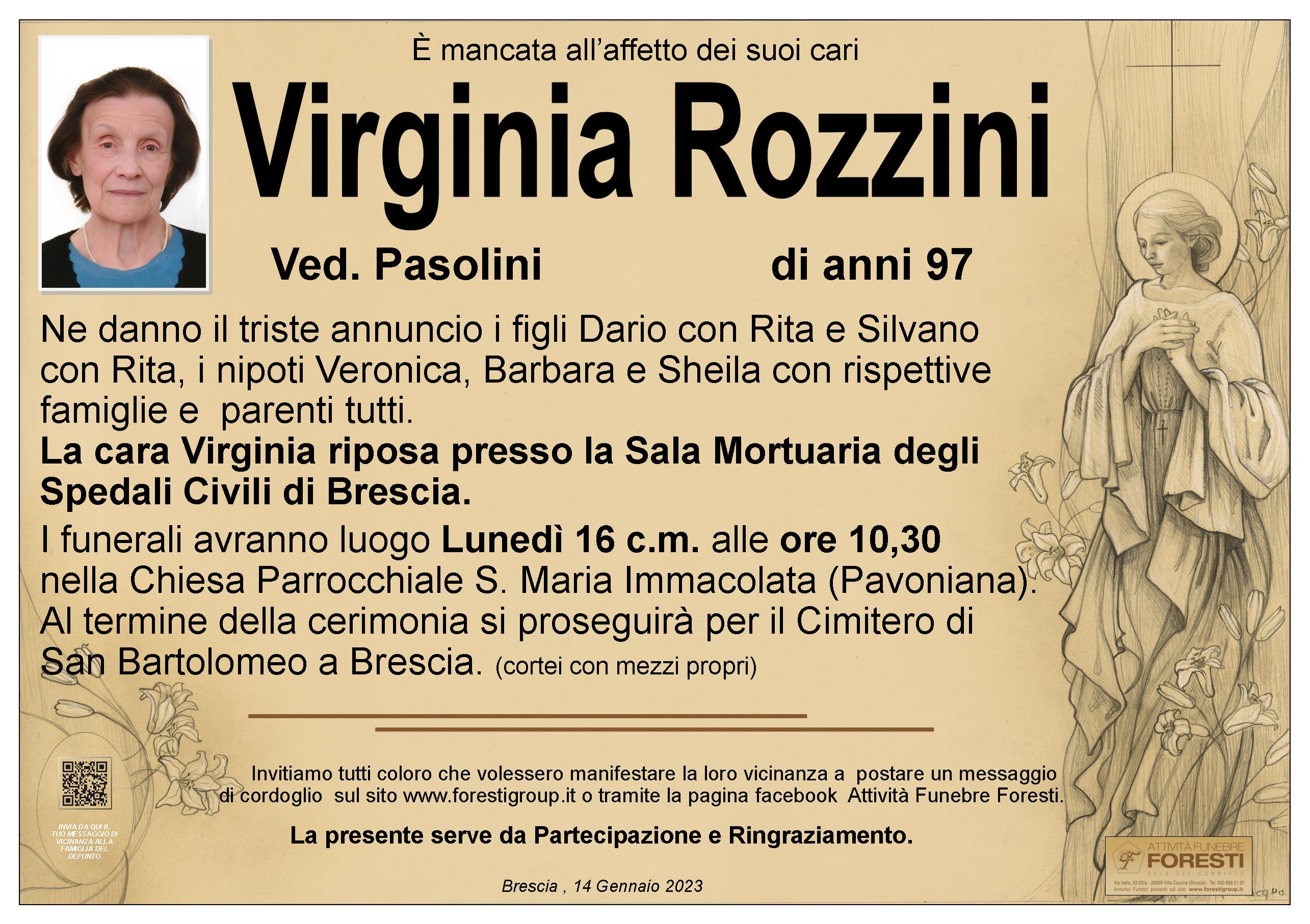 I funerali avranno luogo Lunedì 16 c.m. alle ore 10,30 nella Chiesa Parrocchiale S. Maria Immacolata (Pavoniana). Al termine della cerimonia si proseguirà per il Cimitero di San Bartolomeo a Brescia.