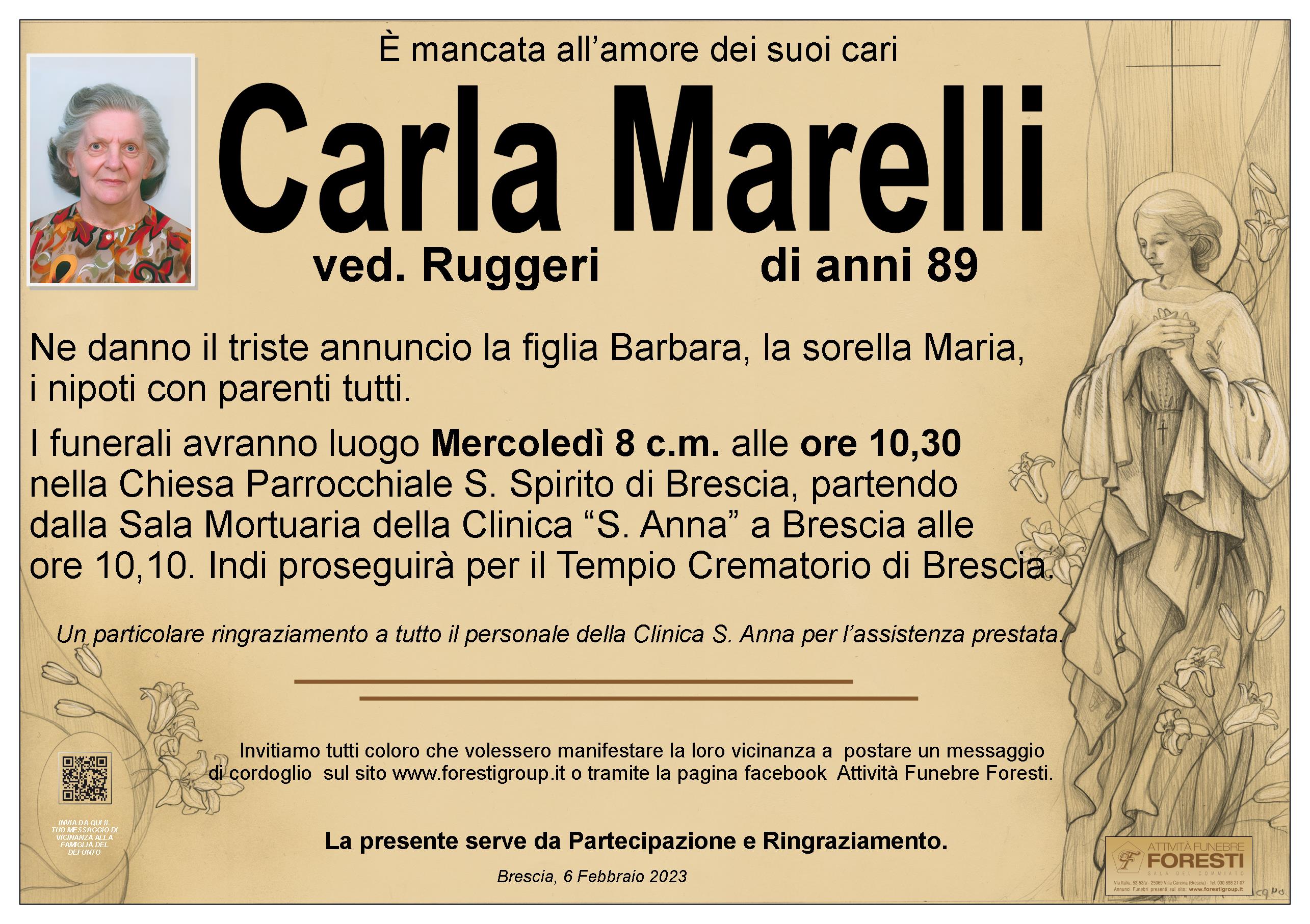 I funerali avranno luogo Mercoledì 8 c.m. alle ore 10,30 nella Chiesa Parrocchiale S. Spirito di Brescia, partendo dalla Sala Mortuaria della Clinica “S. Anna” a Brescia alle ore 10,10. Indi proseguirà per il Tempio Crematorio di Brescia.