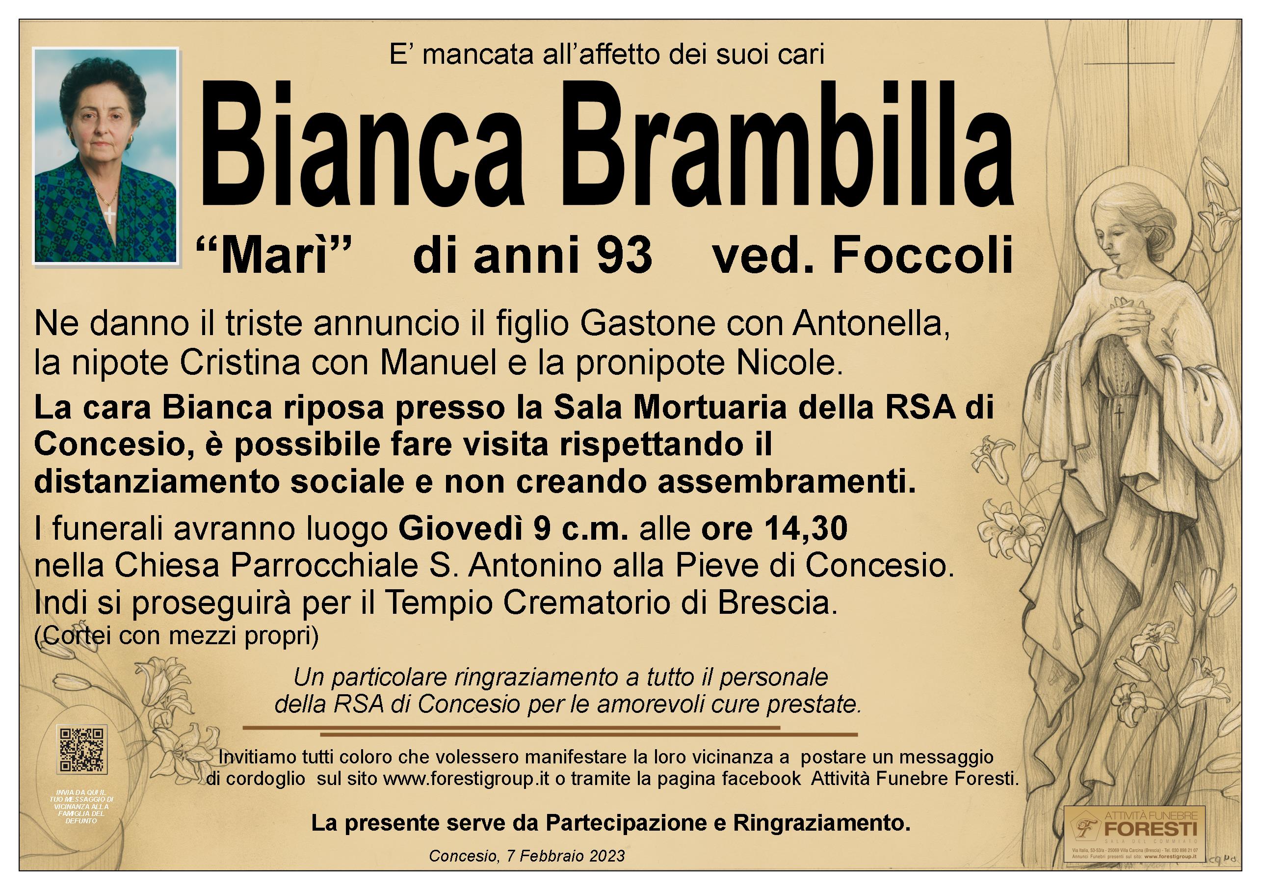 I funerali avranno luogo Giovedì 9 c.m. alle ore 14,30 nella Chiesa Parrocchiale S. Antonino alla Pieve di Concesio. Indi si proseguirà per il Tempio Crematorio di Brescia.