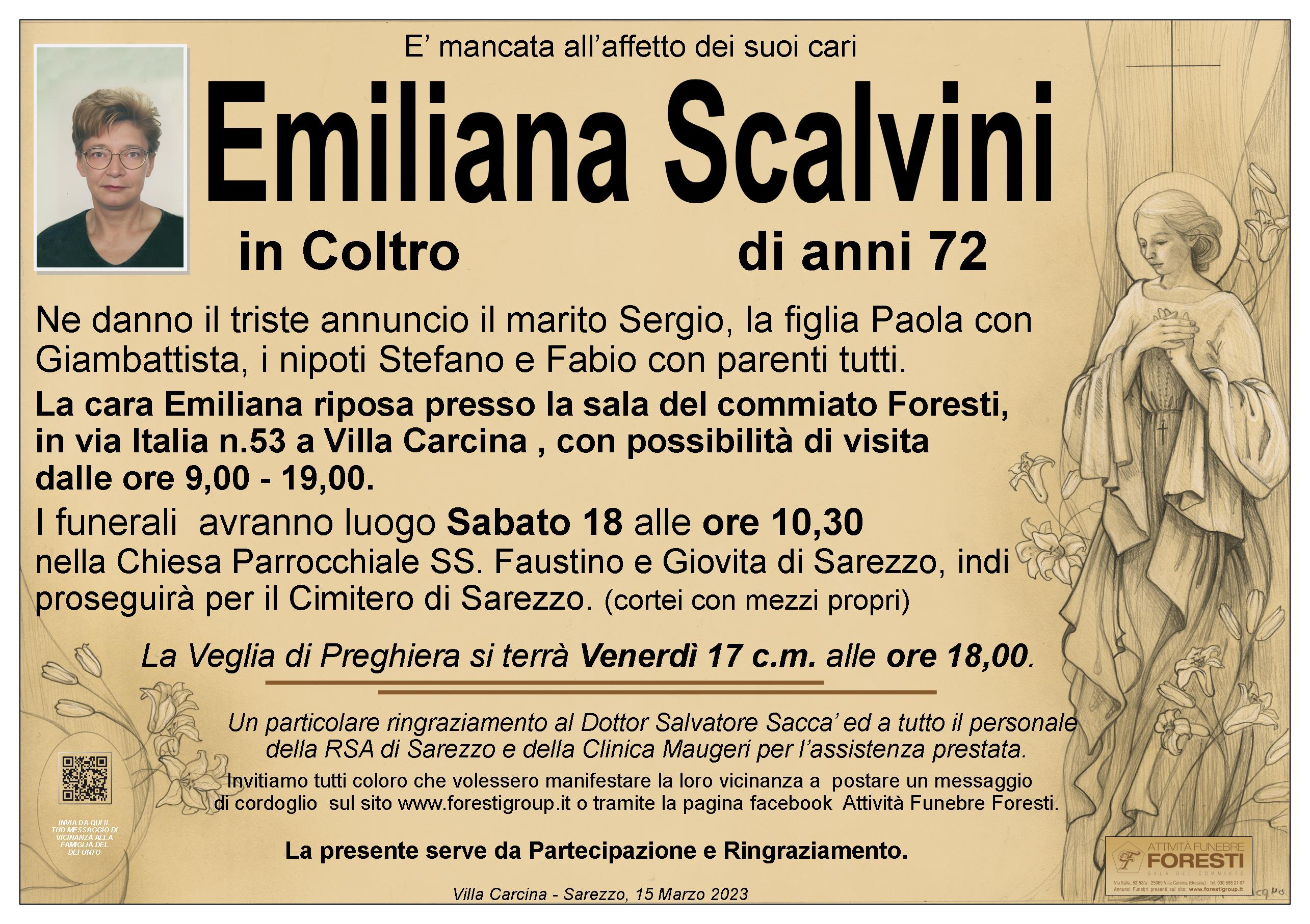 La cara Emiliana riposa presso la sala del commiato Foresti, in via Italia n.53 a Villa Carcina , con possibilità di visita dalle ore 9,00 - 19,00.