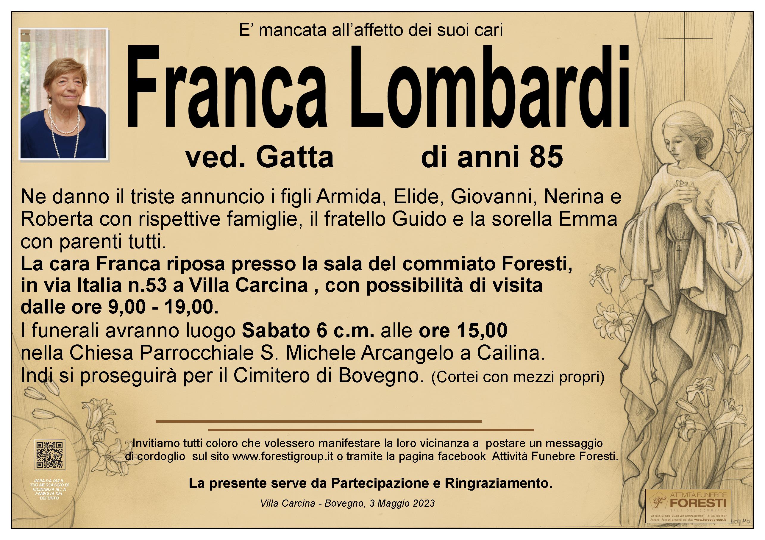 La cara Franca riposa presso la sala del commiato Foresti, in via Italia n.53 a Villa Carcina , con possibilità di visita dalle ore 9,00 - 19,00.