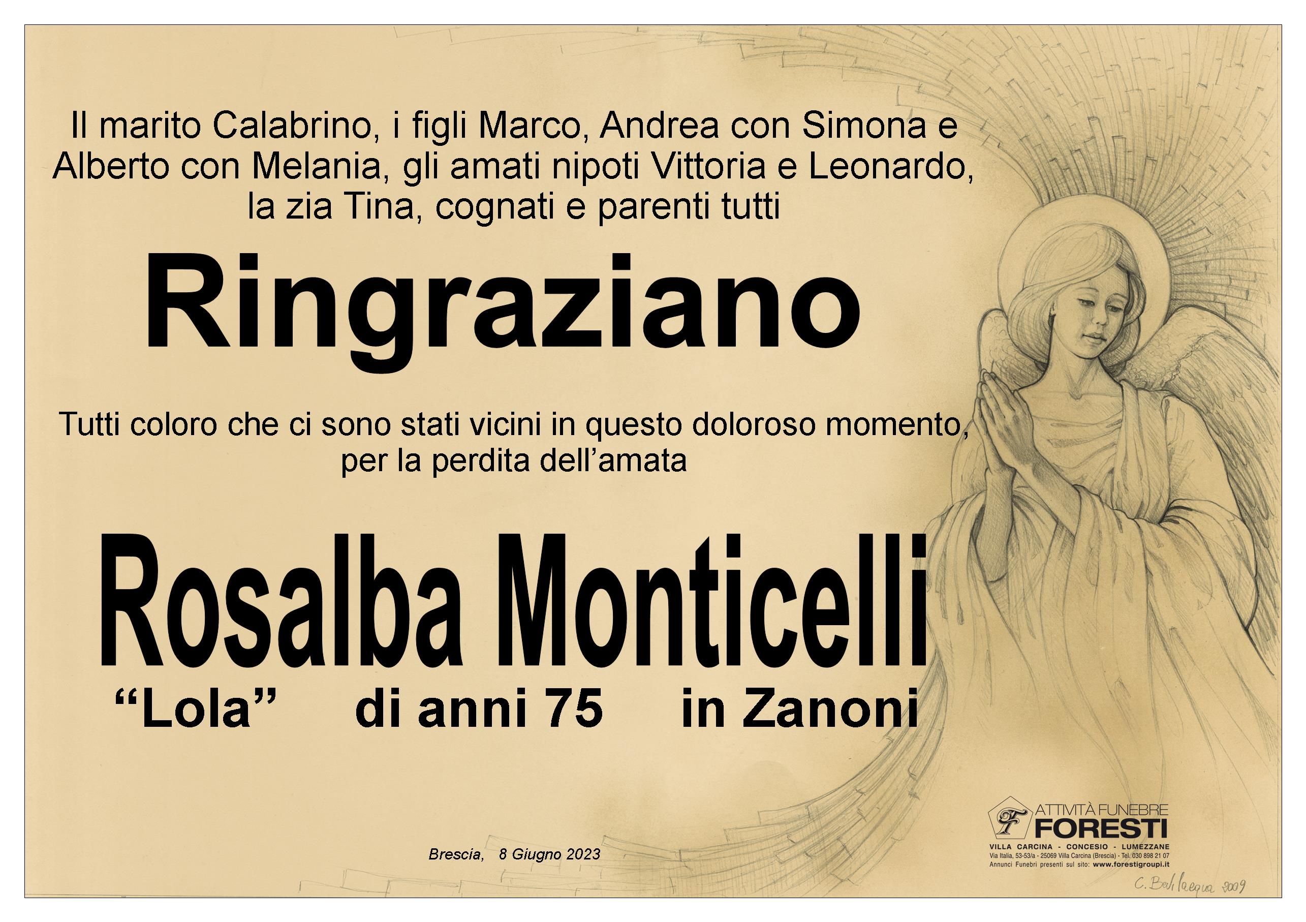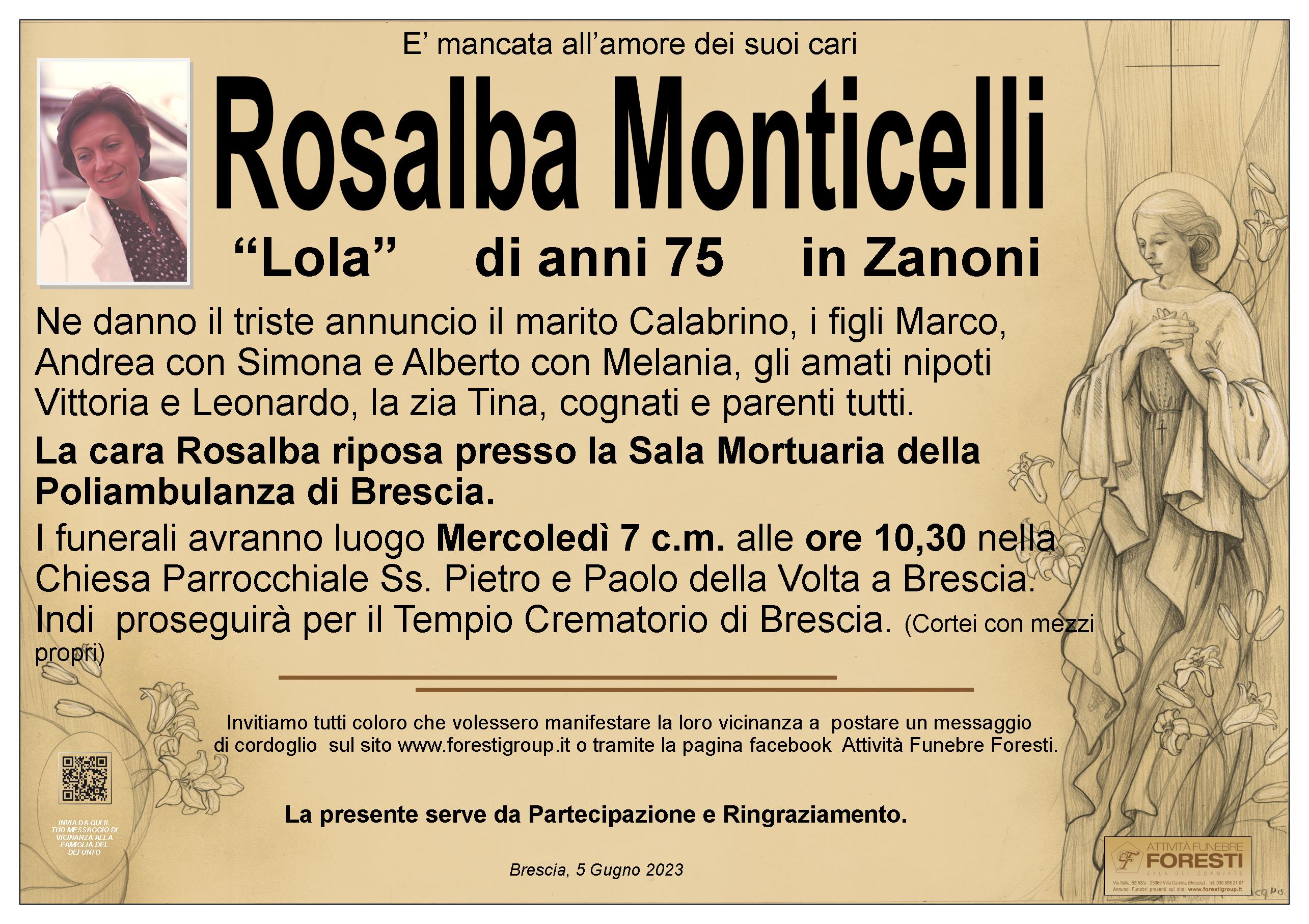 I funerali avranno luogo Mercoledì 7 c.m. alle ore 10,30 nella Chiesa Parrocchiale Ss. Pietro e Paolo della Volta a Brescia. Indi proseguirà per il Tempio Crematorio di Brescia.