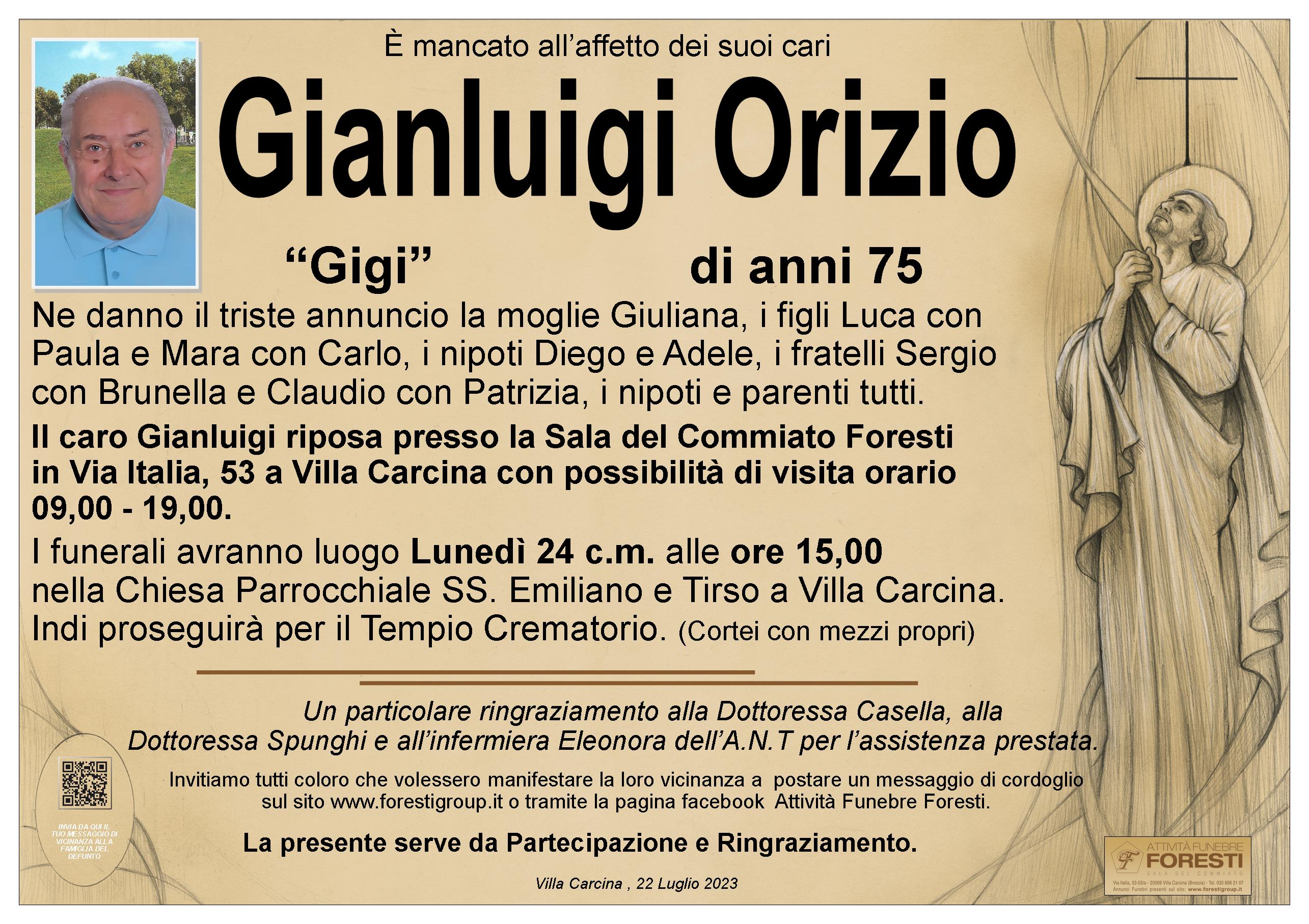 Il caro Gianluigi riposa presso la Sala del Commiato Foresti in Via Italia, 53 a Villa Carcina con possibilità di visita orario 09,00 - 19,00.