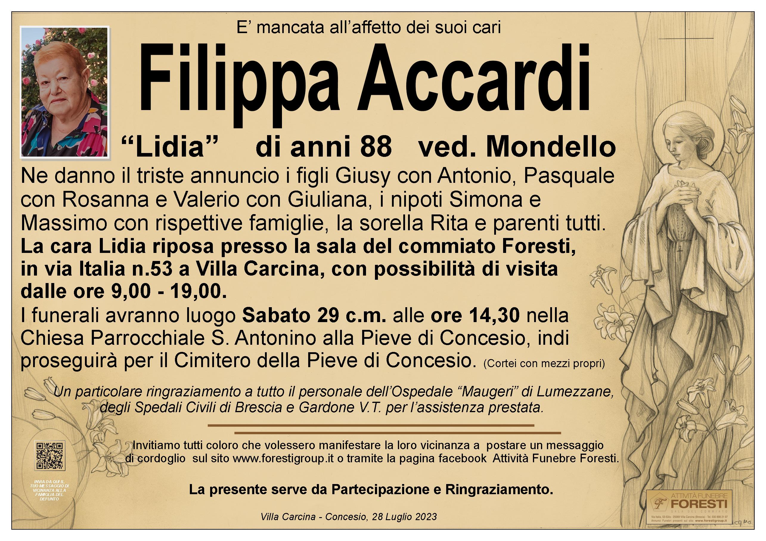 La cara Lidia riposa presso la sala del commiato Foresti, in via Italia n.53 a Villa Carcina, con possibilità di visita dalle ore 9,00 - 19,00.