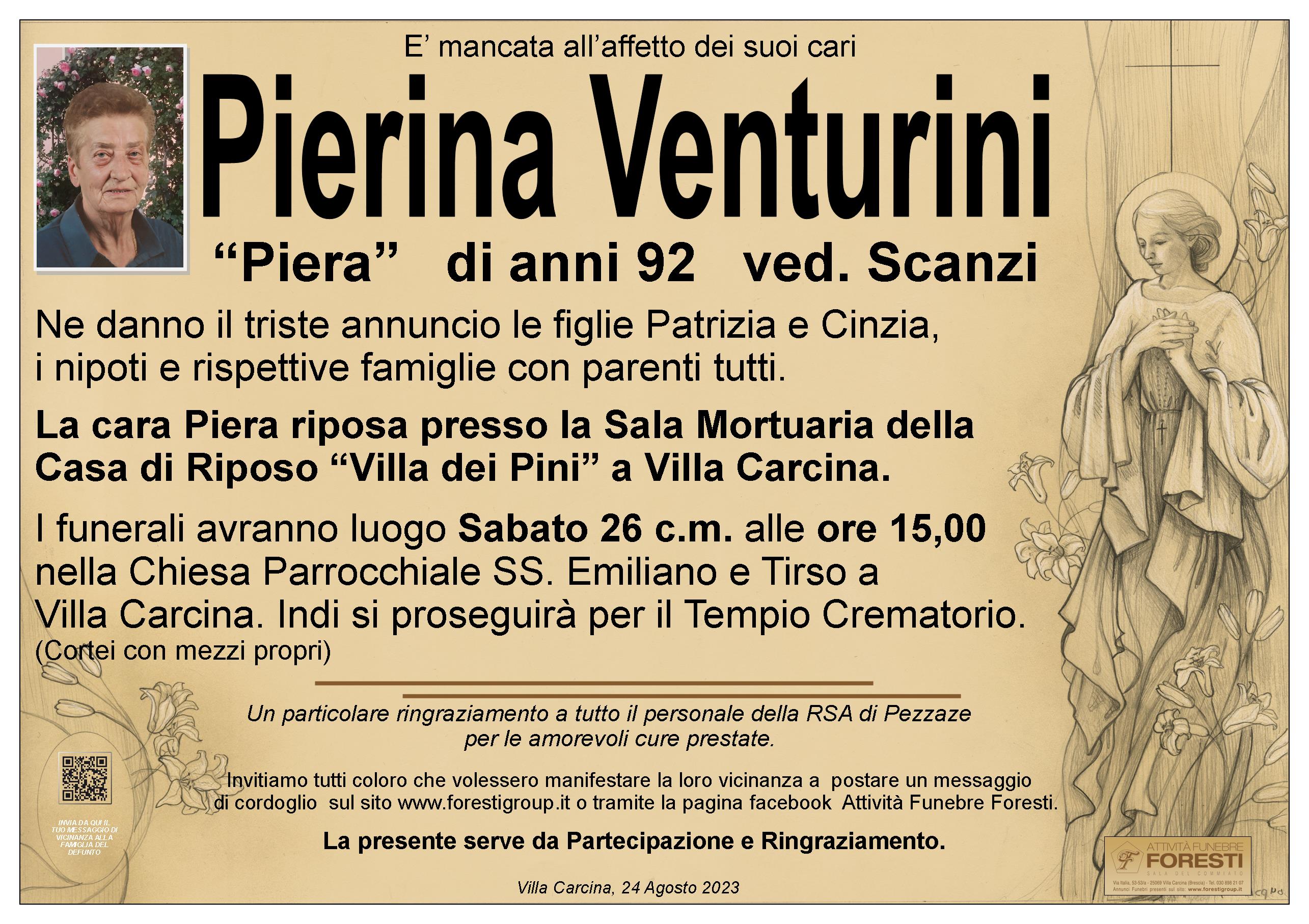 I funerali avranno luogo Sabato 26 c.m. alle ore 15,00 nella Chiesa Parrocchiale SS. Emiliano e Tirso a Villa Carcina. Indi si proseguirà per il Tempio Crematorio.