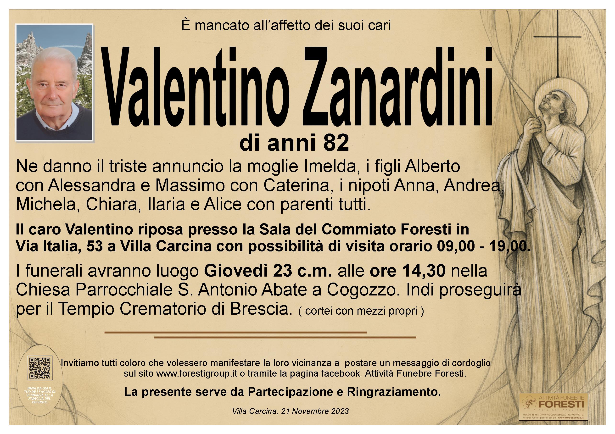 Possa la grazia di Dio confortarvi durante questo momento di dolore, e la speranza della vita eterna portarvi serenità. A Imelda, ai figli Alberto, Massimo e alle loro famiglie la comunità parrocchiale di Cogozzo porge sentite condoglianze per la perdita del caro Valentino.