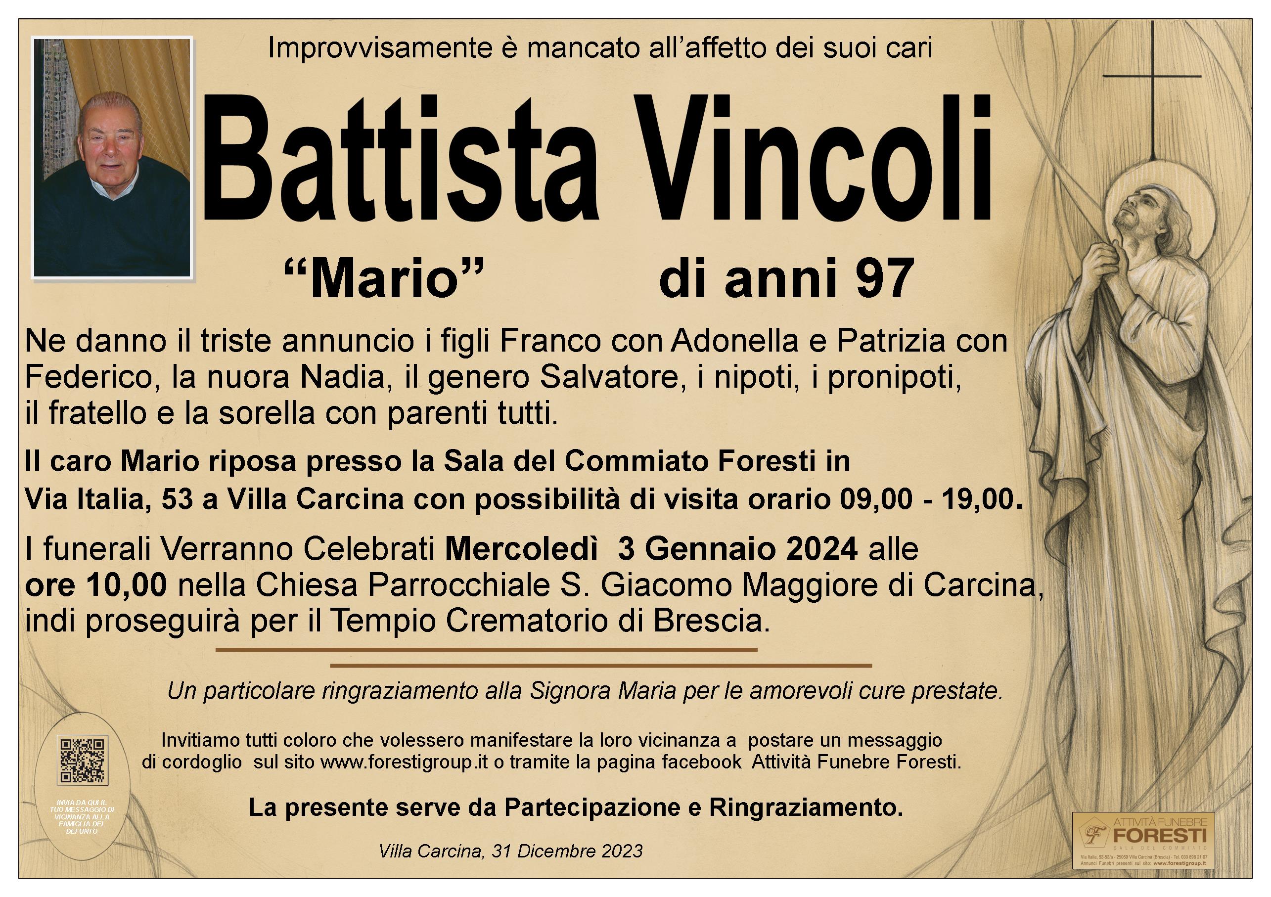 I funerali Verranno Celebrati Mercoledì 3 Gennaio 2024 alle ore 10,00 nella Chiesa Parrocchiale S. Giacomo Maggiore di Carcina, indi proseguirà per il Tempio Crematorio di Brescia.