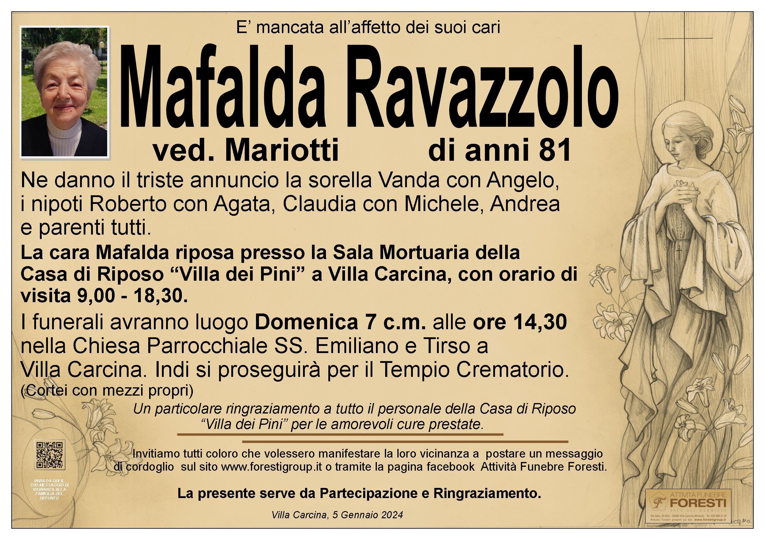 La cara Mafalda riposa presso la Sala Mortuaria della Casa di Riposo “Villa dei Pini” a Villa Carcina, con orario di visita 9,00 - 18,30.