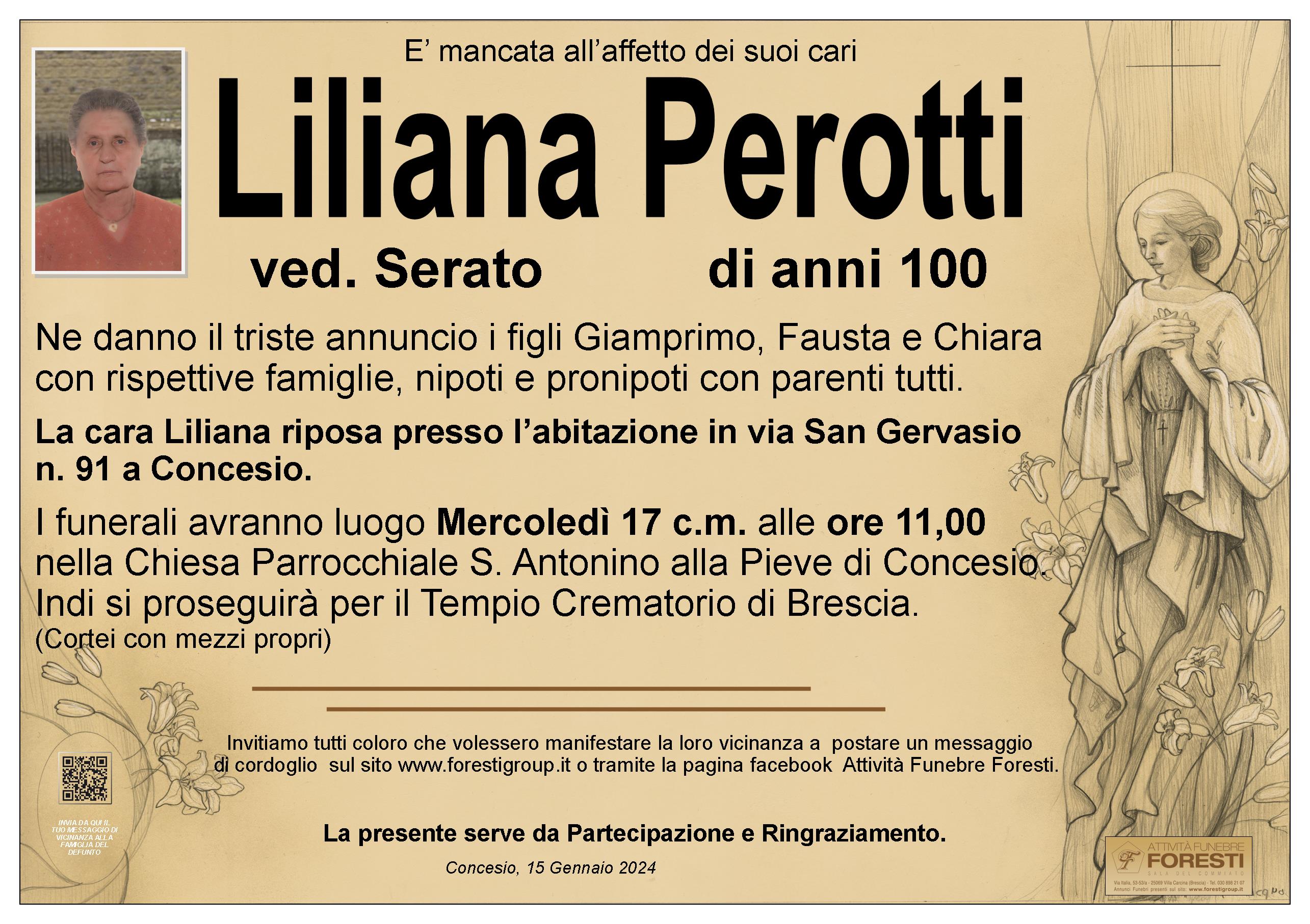 I funerali avranno luogo Mercoledì 17 c.m. alle ore 11,00 nella Chiesa Parrocchiale S. Antonino alla Pieve di Concesio. Indi si proseguirà per il Tempio Crematorio di Brescia.