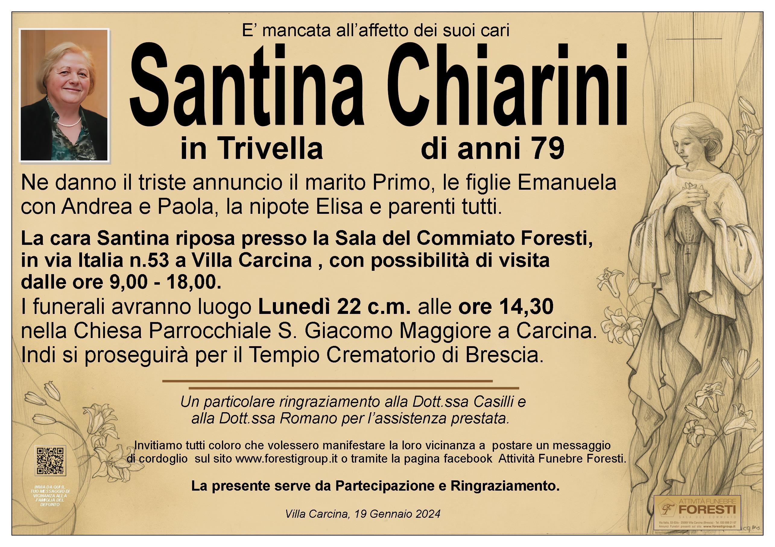La cara Santina riposa presso la Sala del Commiato Foresti, in via Italia n.53 a Villa Carcina , con possibilità di visita dalle ore 9,00 - 18,00.