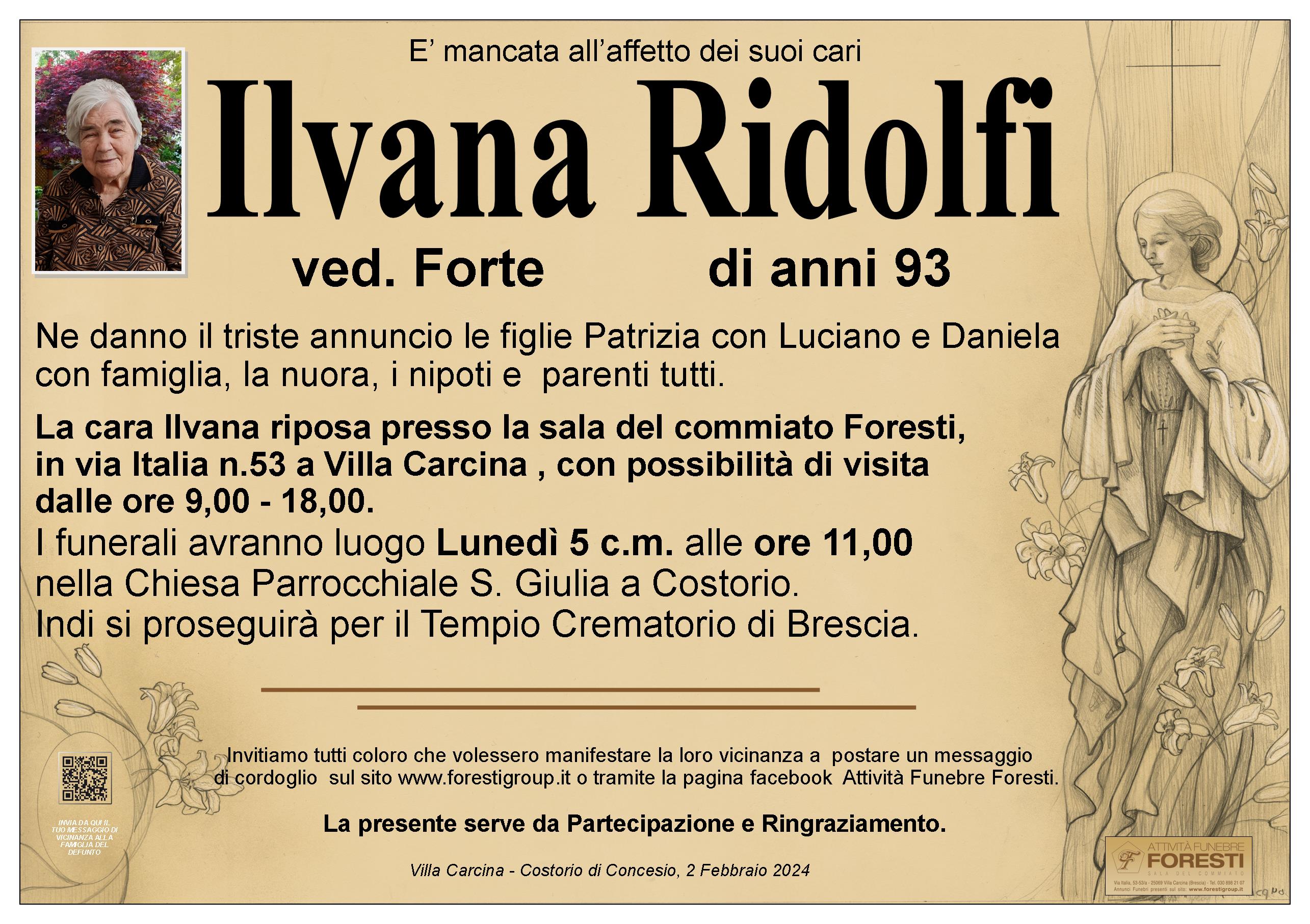 La cara Ilvana riposa presso la sala del commiato Foresti, in via Italia n.53 a Villa Carcina , con possibilità di visita dalle ore 9,00 - 18,00.